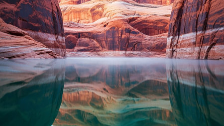 Orange sandstone canyon walls with intricate layers are mirrored in the still, turquoise water below.