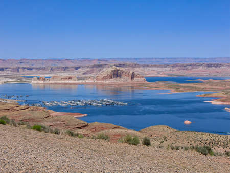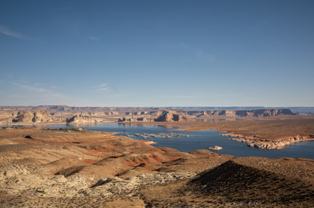 Expansive view of Lake Powell with rugged desert landscape and marina under a clear sky in Arizona. Concept of nature exploration, water conservation, and desert tourism.