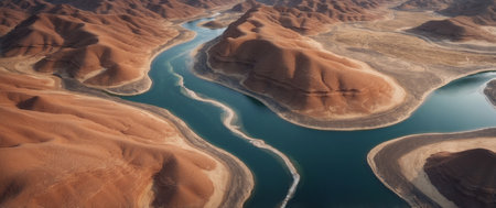 AI Generated. Aerial View of a Winding River Cutting Through a Desert Landscape