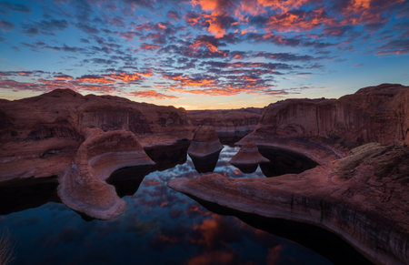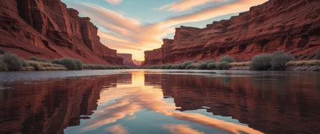 AI Generated. Serene river reflection amidst rocky canyon walls at sunset