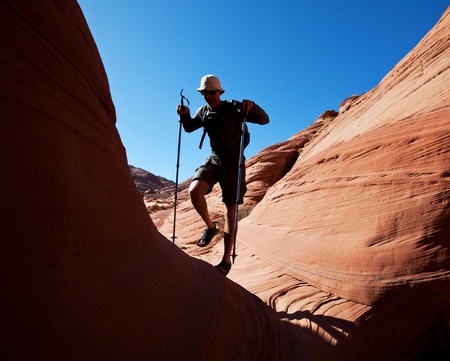 Unusual natural background. Reflection Canyon on Lake Powell, Utah, USA. Inspiring hiking scene-man resting on the beautiful sunset point.