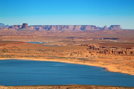View down dam lake powell on sunny blue sky in summer. clean river water surrounding by desert in usa. beautiful nature wild in america.