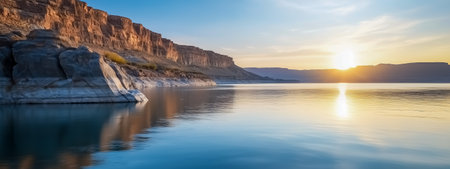A peaceful sunset reflecting on calm waters beside rugged cliffs and blue sky