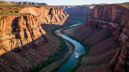 Stunning Canyon with River Majestic Landscape View with Red Rock Formations and Serene Waterway.