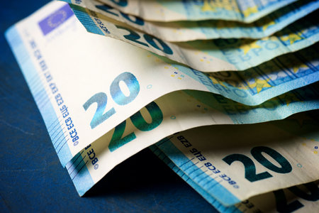 Selective focus on detail of euro banknotes. Close up macro detail of money banknotes, 20 euro isolated. World money concept, inflation and economy concept