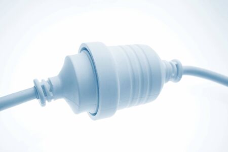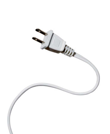 White plastic and metal pins power plug close up macro shot isolated on white.