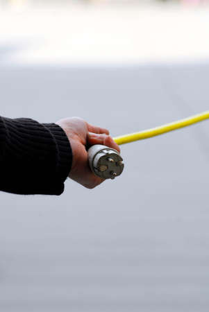 Hand with electrical power cable. Yellow background, flat lay, top view and copy space