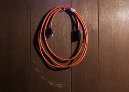 Coiled red electrical cable or lead with a three prong integrated Australian plug on a blue background