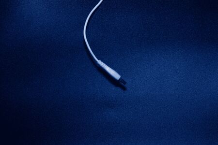 White wire for charging your phone on a blue background. Tinted photo in the fashionable classic blue color of the year. Copy space, close-up