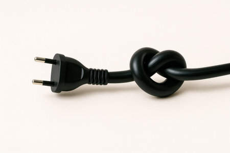 Black tangled cable lying on a smooth light surface with intricate knots and twisted loops, minimalistic modern composition.