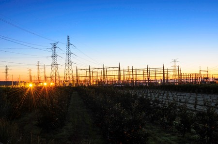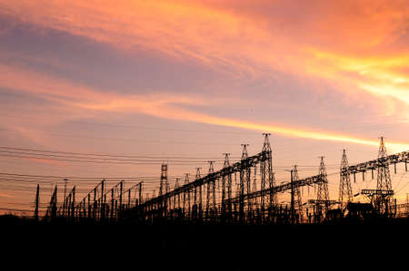 Electric substation with power lines and transformers, at sunset