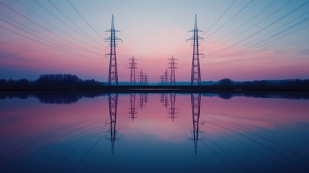 Captivating landscape featuring rows of power lines silhouetted against a stunning sunrise, reflecting on tranquil water, creating a serene environment.