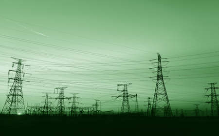 High voltage power lines, iron towers, green background.
