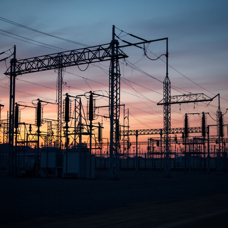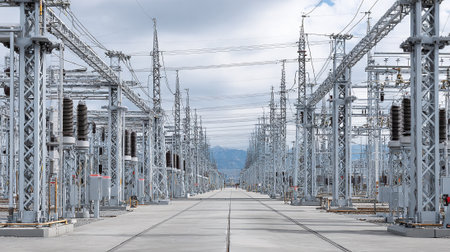 Captivating image of a modern industrial power station showcasing high voltage equipment under a cloudy sky, emphasizing energy infrastructure and urban technology.