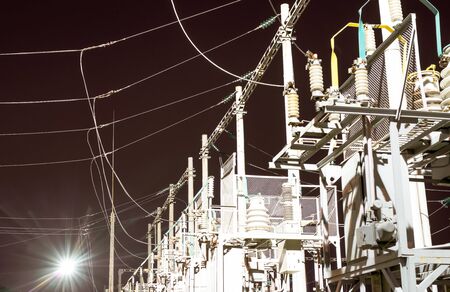 Electric substation with high-voltage equipment - isolators, bearings, transformers, wires, etc. at night