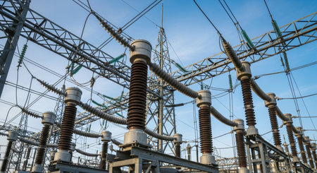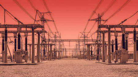 Hyper realistic power substation with three phase transmission lines under a clear blue sky