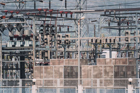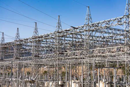 Power plant - transformation station. Multitude of cables and wires.
