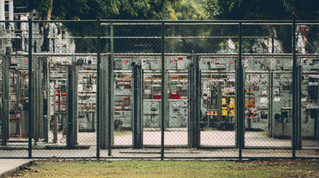 A closeup view of an outdoor utility substation featuring a network of interlinked digital devices and monitoring sensors all safeguarded by a robust fence with warning signs emphasizin