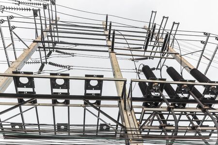 High voltage obsolete vintage electrical substation. Closeup on wiring, connections and insulators of a electrical substation.