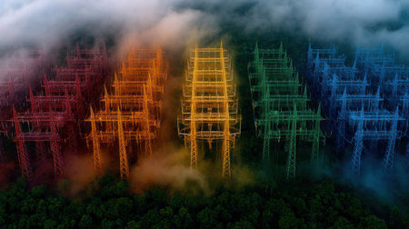 A colorful array of power lines are visible in the sky. The colors are bright and vibrant, creating a sense of energy and excitement. The power lines are spread out across the sky