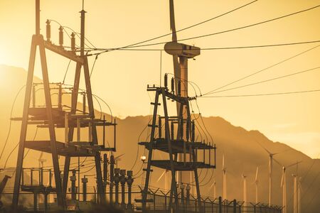 Electric Power Transmission. Electrical Infrastructure During Sunset. Energy Industry.