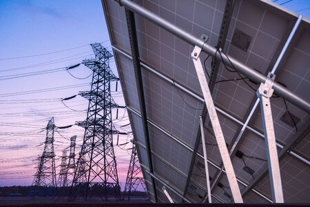Solar photovoltaic panels and transmission towers at sunset. Alternative power sources - the concept of sustainable resources