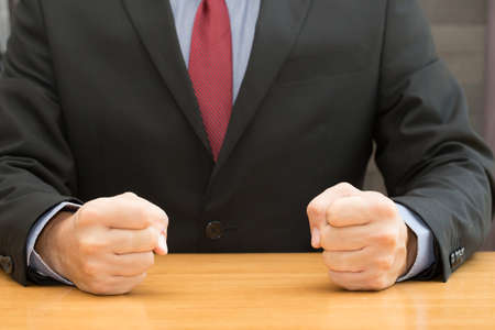 Businessman with clenched fist on the desk at office