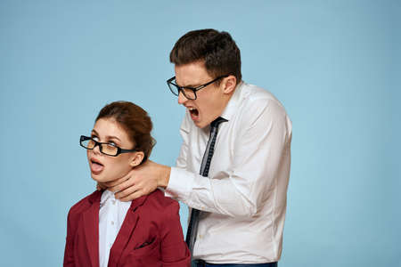 business man and woman office officials communication work colleagues studio blue background