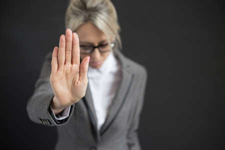 businessman hand stop sign on gray background