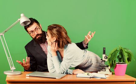 Student sensual girl and experienced teacher. Resist temptation. Stop harassment. Breaking rules. Teacher and attractive female. Banned relations concept. Private lesson. Flirting with teacher
