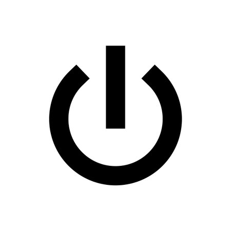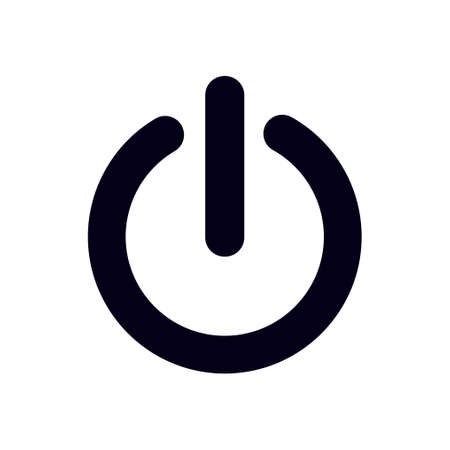 A simple white power button icon is centered against a solid black background. The design features a clean, minimalistic style with a circular outline and vertical line. It showcases a flat, overhead lighting effect. Ideal for digital design projects or presentations, the image may serve various commercial and editorial purposes.