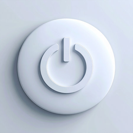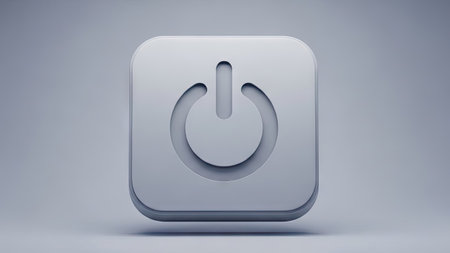A close-up view presents a power button icon on a square background, constructed with a minimalist design. The image showcases soft, diffused lighting with subtle shadows, creating a sense of depth and dimension. Suitable for various design projects and digital interfaces, the imagery can enhance presentations and online content.