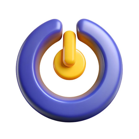 A 3D rendered power button icon in blue and yellow. This icon is perfect for use in websites. apps. presentations. and more.