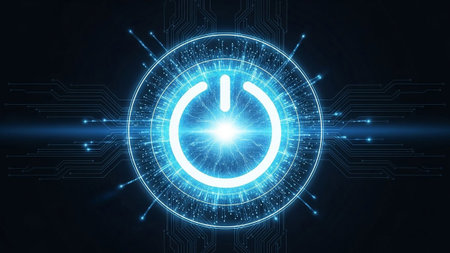 Power button symbol illuminated with futuristic glow on digital circuit board