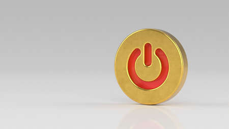 Gold Power button sign with red glow lines isolated on gray white background. Turn on or turn off. Energy start and stop concept. 3D illustration