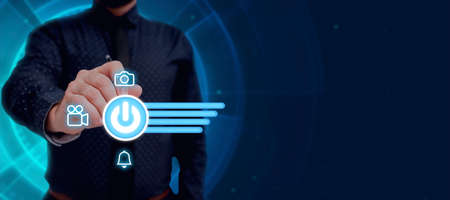 Hand is pressing the power button to activate a future power system or startup. power and start concept