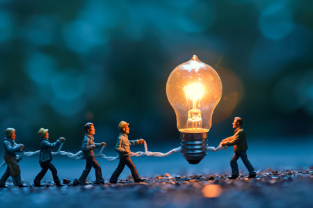Group of people are pulling a light bulb. The scene is playful and lighthearted, with the people working together to move the light bulb