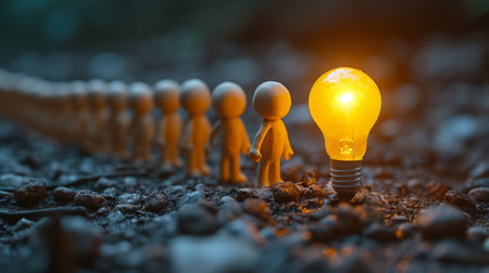 Small wooden figures standing in line towards glowing light bulb, leadership and innovation concept
