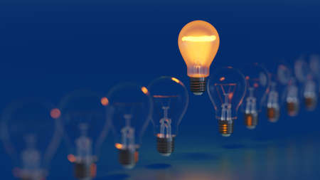One being on light bulb illuminate in rows of darkened incandescent lamp, concept of leader innovation and solutions, 3D rendering.