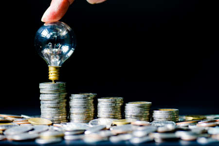 Hand holding a light bulb rises up with investment for business growth and dollar yuan yen euro and pound sterling sign. Global currency exchange concept
