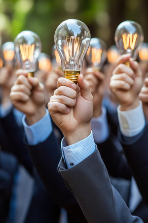 Group of people holding lit lightbulbs symbolizing innovation and ideas.