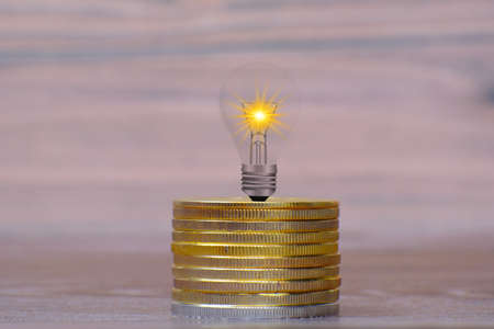 A yellow light bulb on a yellow wire on a purple background. Minimalism. The concept of energy and business. Flat lay.