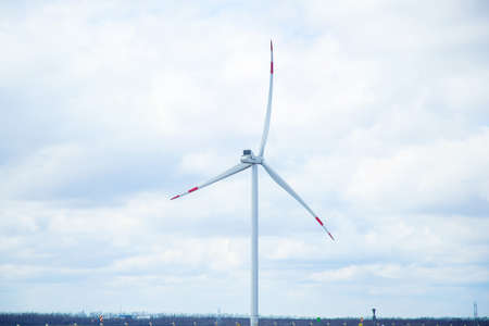 Horizontal axis wind turbine with grey sky and clouds. Wind energy in eco wind farm. Green energy concept. Renewal energy. Alternative electricity source. Sustainable resources.