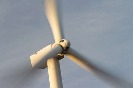 Windmills for electricity generation. Green energy concept. Background with copy space for text. Huge blades close up.
