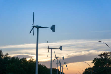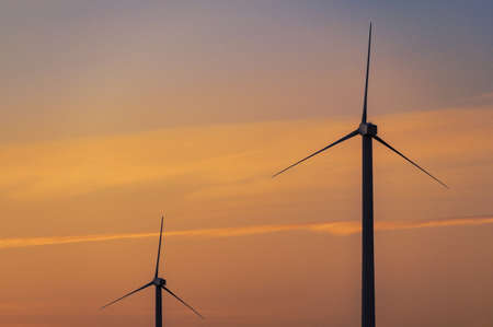 Evening landscape of wind turbine windmills for electric power production and sunset sky