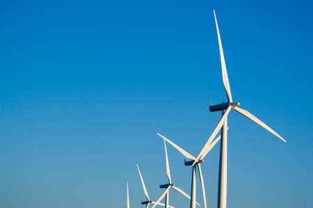 Windmills alternative energy source against clear blue sky background. The towering white windpumps have three blades that produces renewable energy using wind.