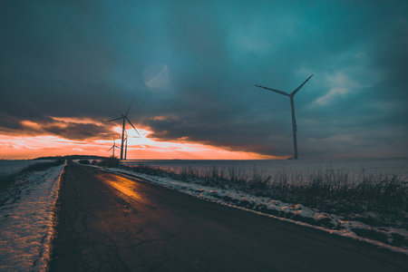 An image of windturbines on a snowy road at sunset