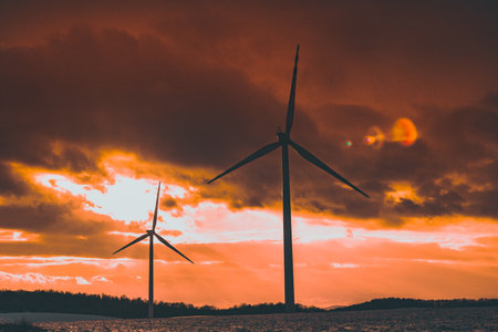 silhouettes of wind turbines with a beautiful sunset Estonia Paldiski