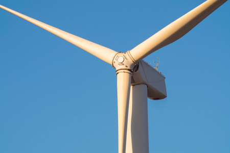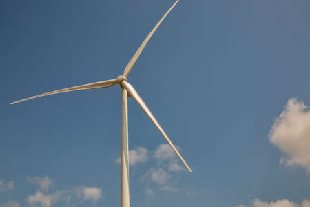 White wind turbine for alternative energy in day with blue sky background, electric clean power concept