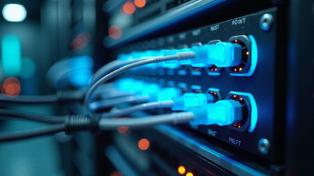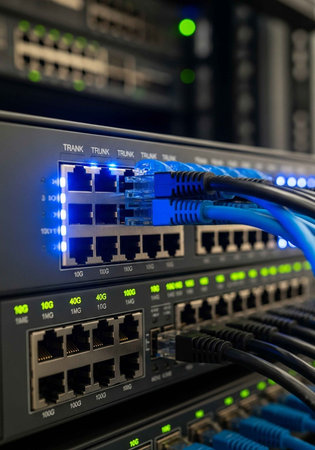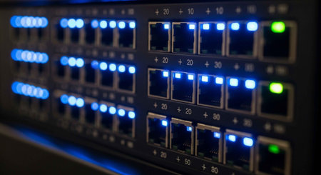 A close-up view of a network switch with multiple ports and glowing blue lights